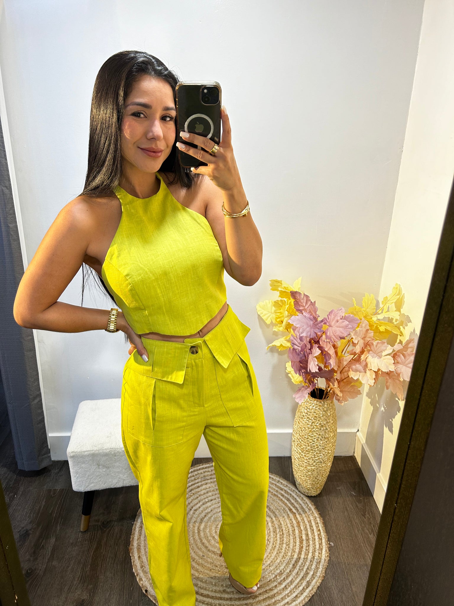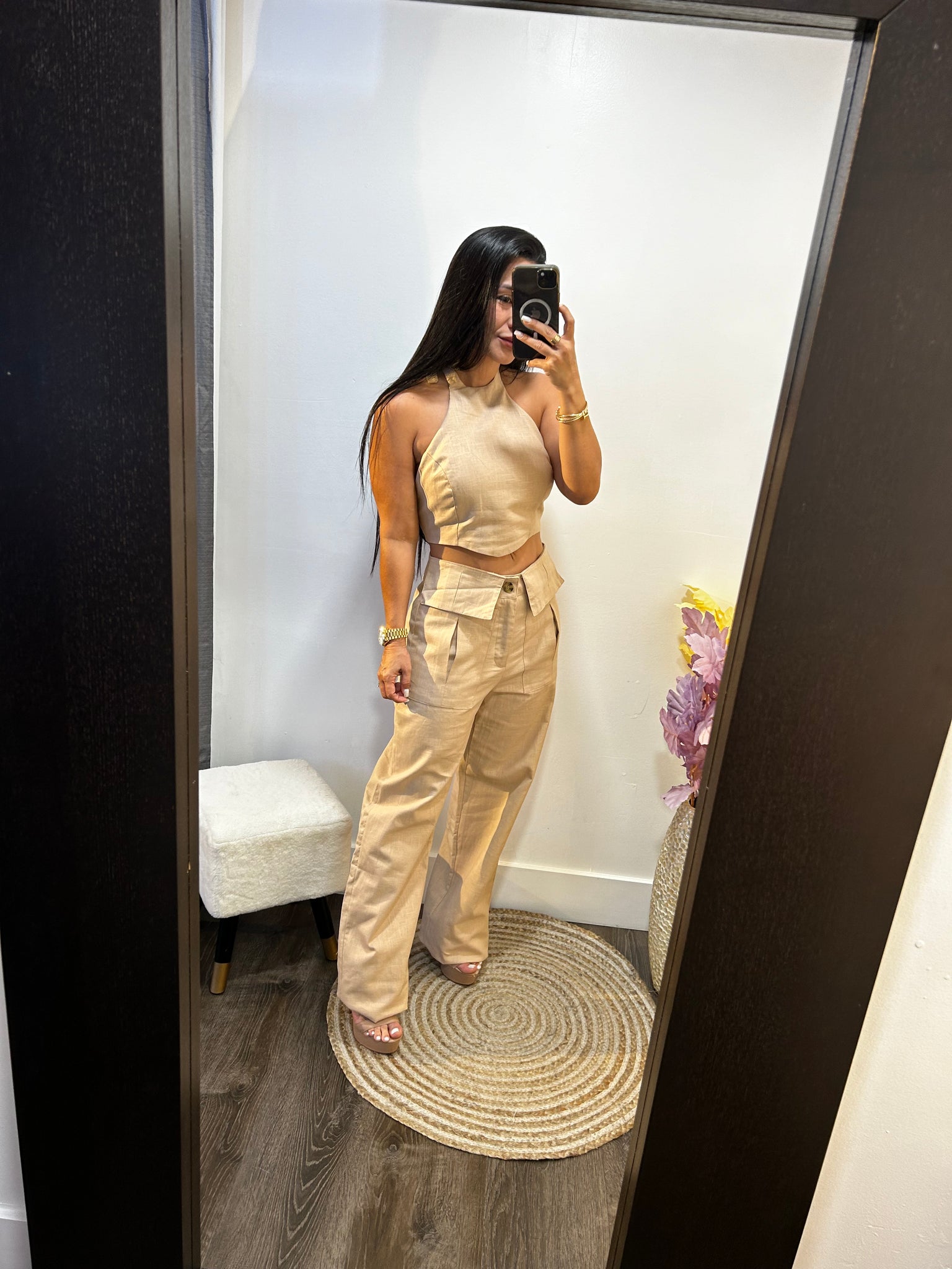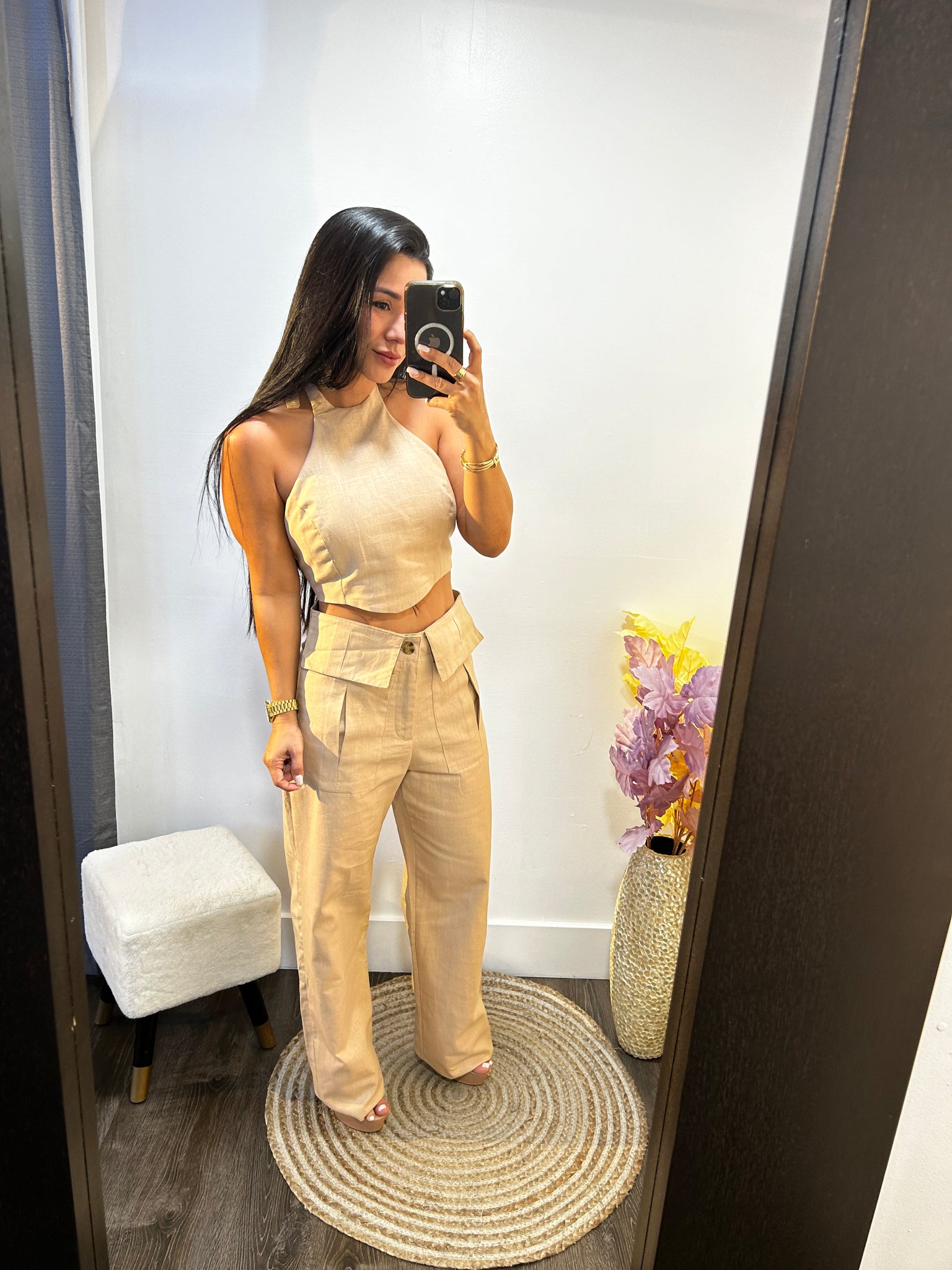 pantalón alto con detalle en la parte de adelante de bolsillos.