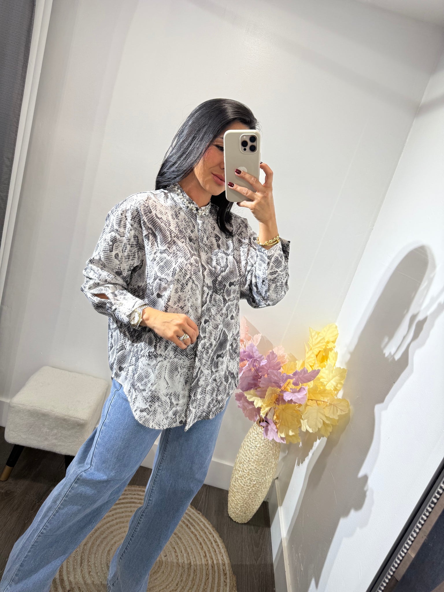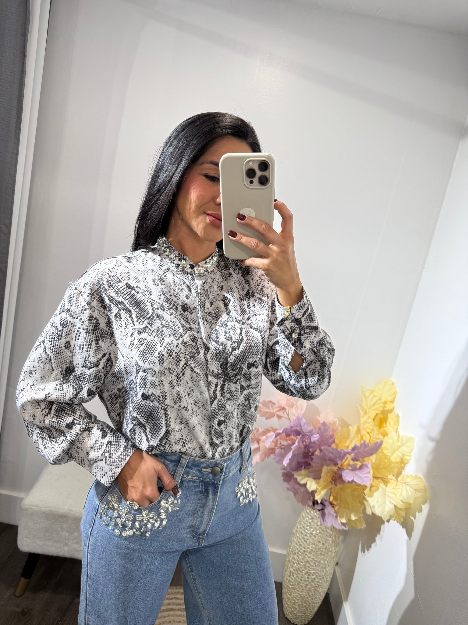 Camisa manga larga de botones con detalle de piedras en el Cuello