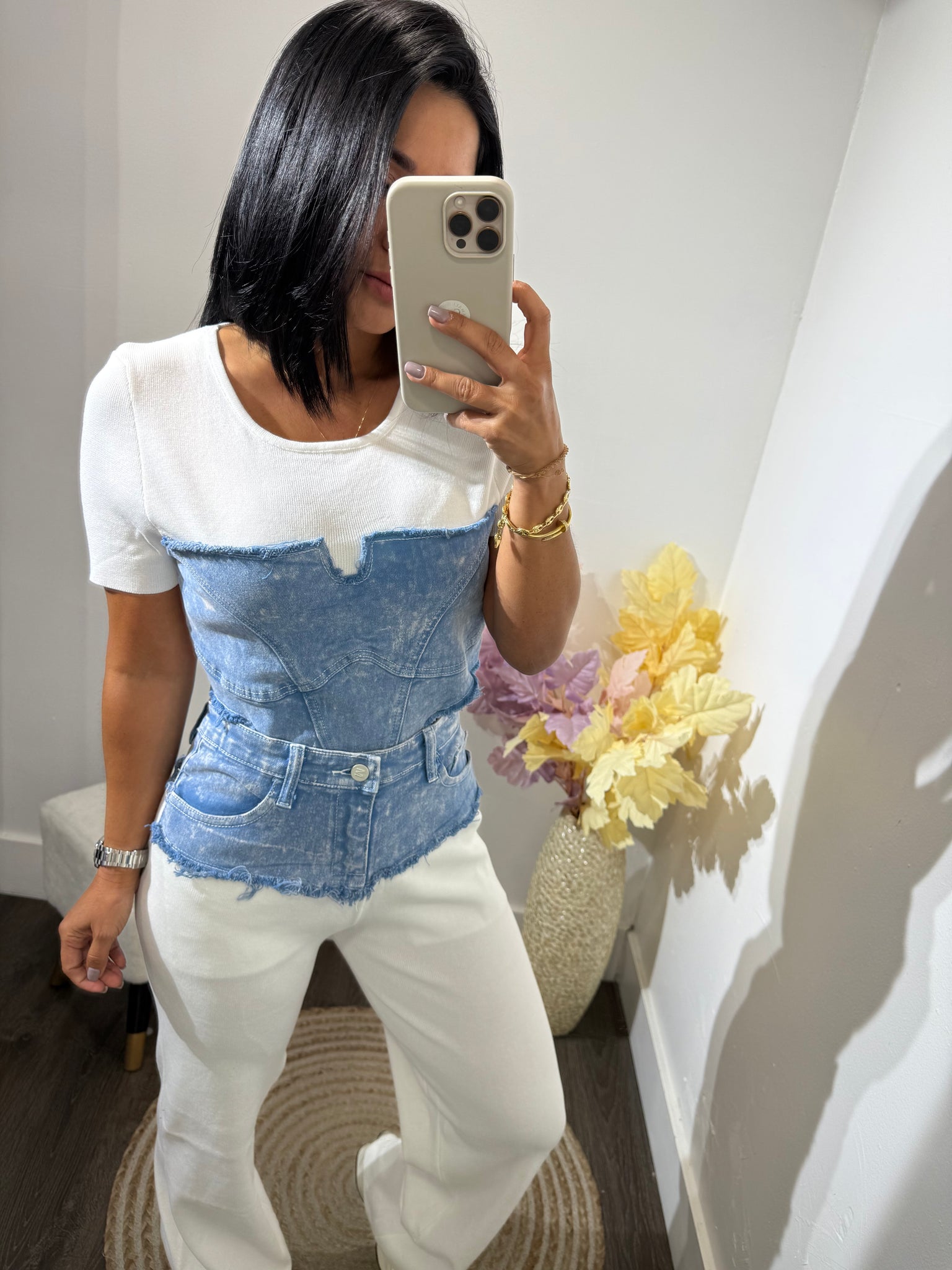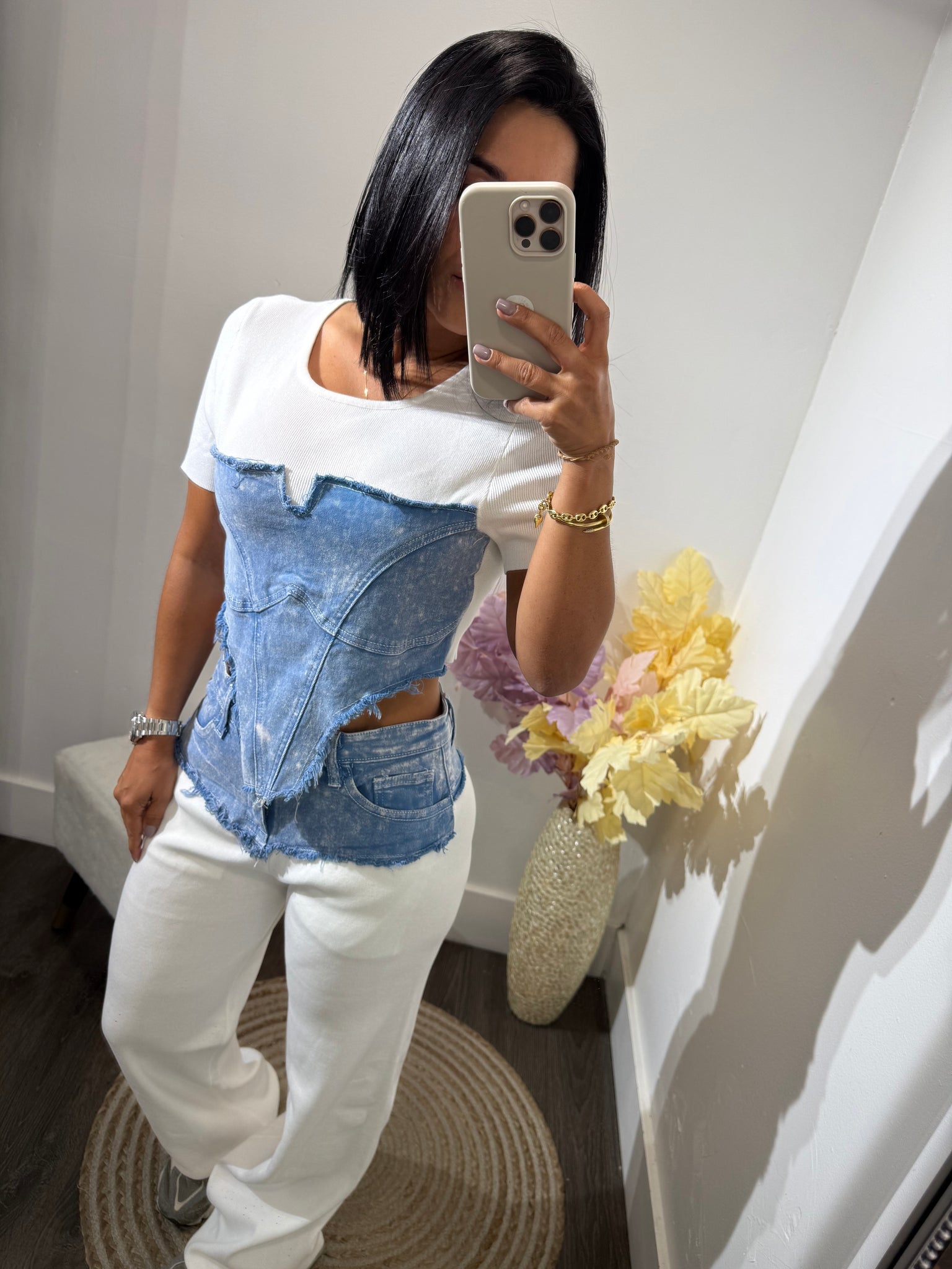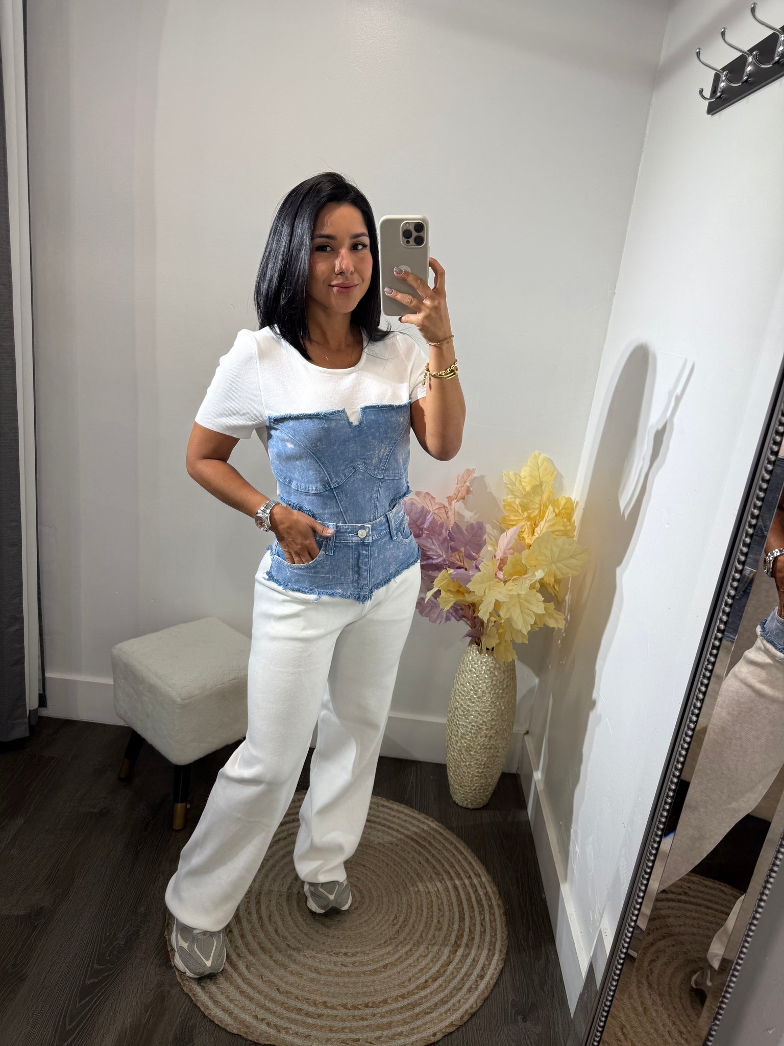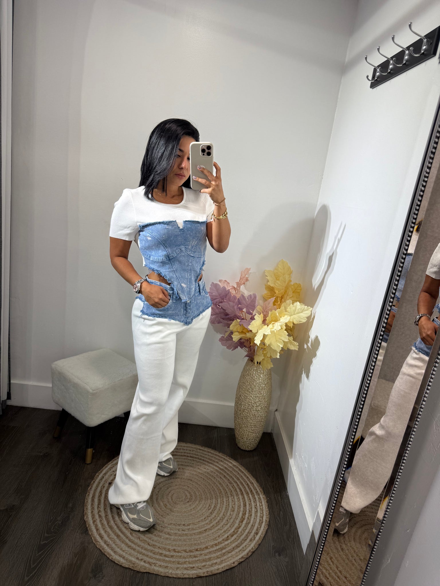 Set deportivo, combinado de jean y tela de tejido de punto.