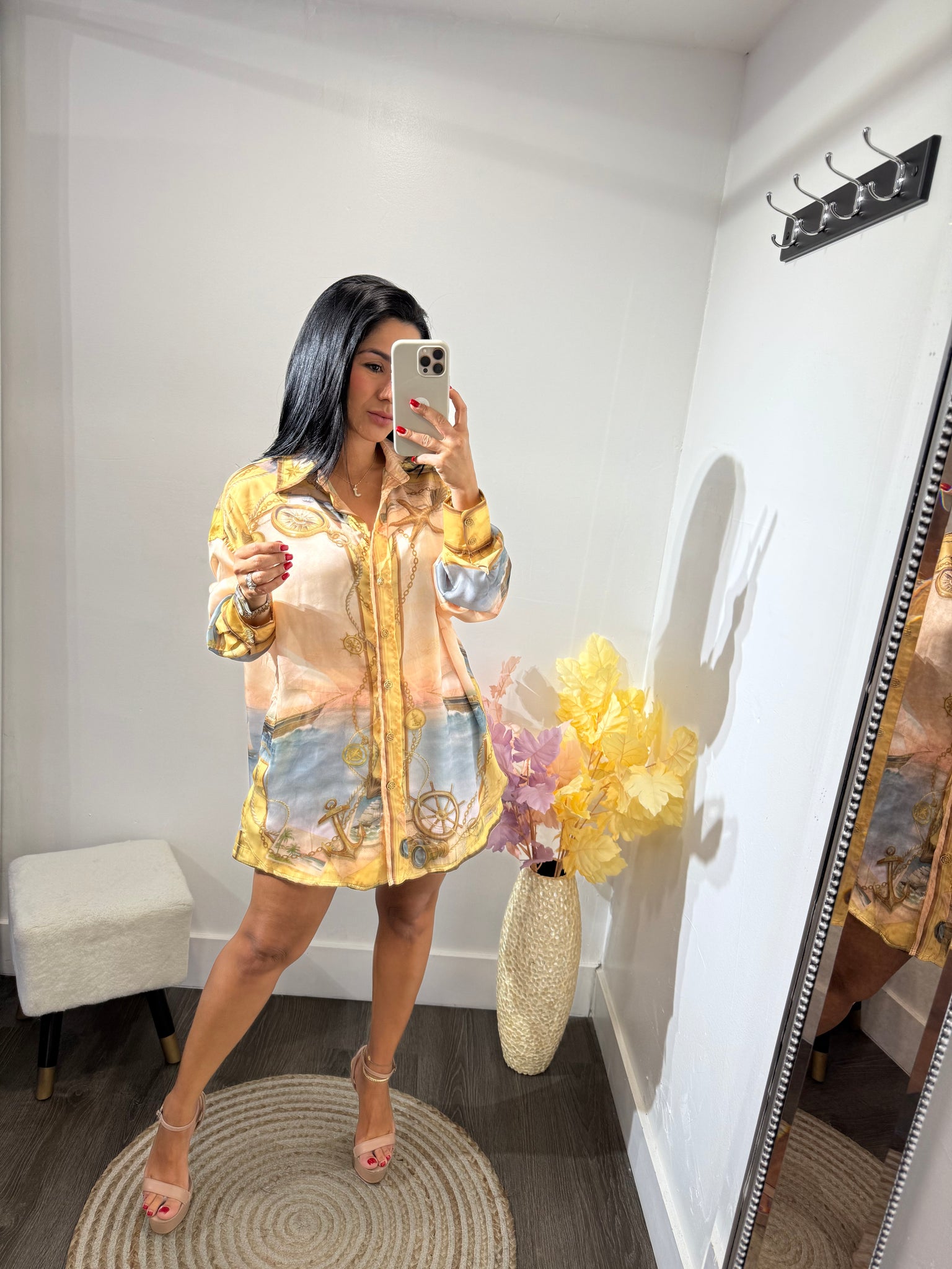 Set satinado estampado de dos piezas con botones dorados