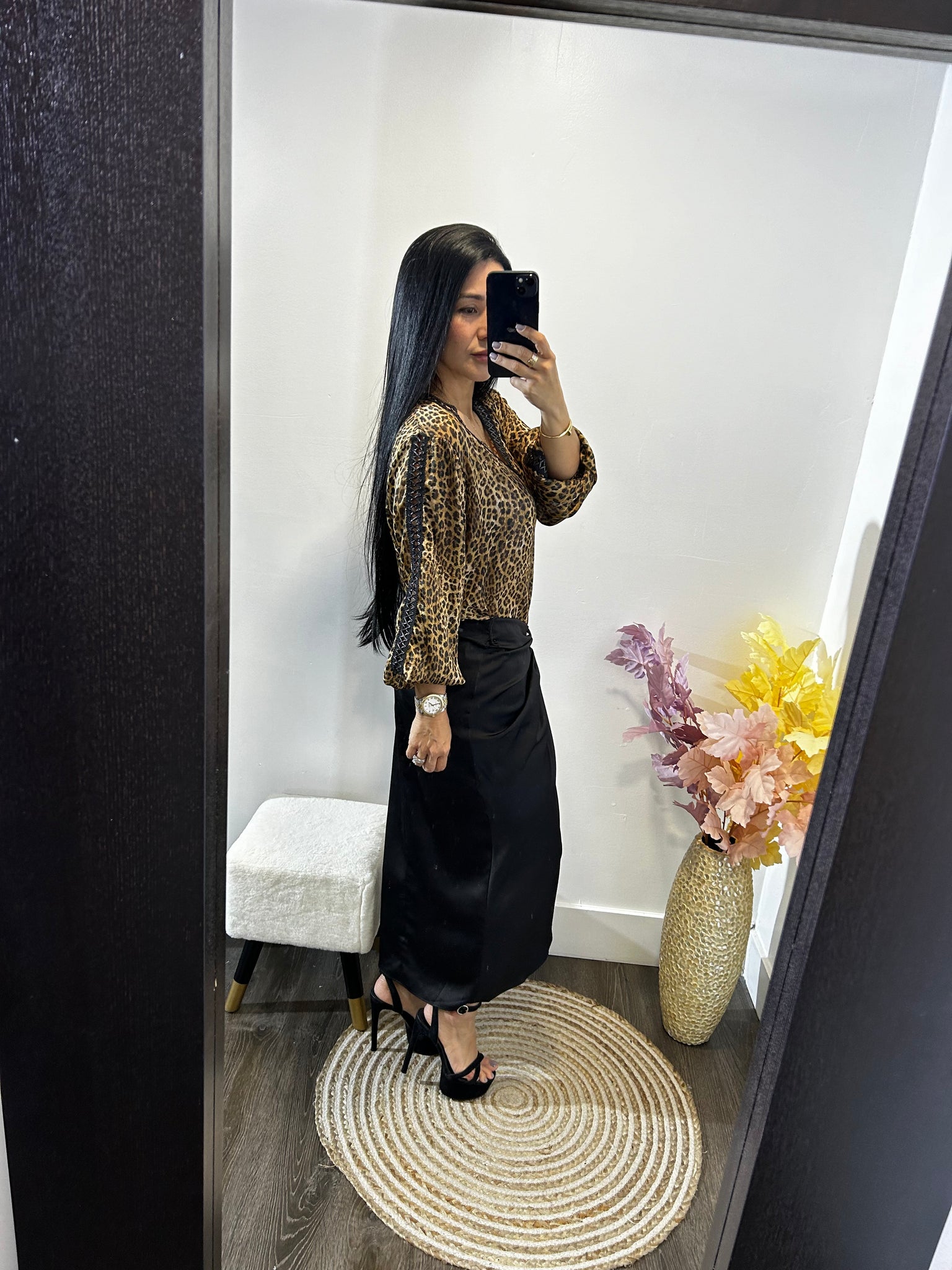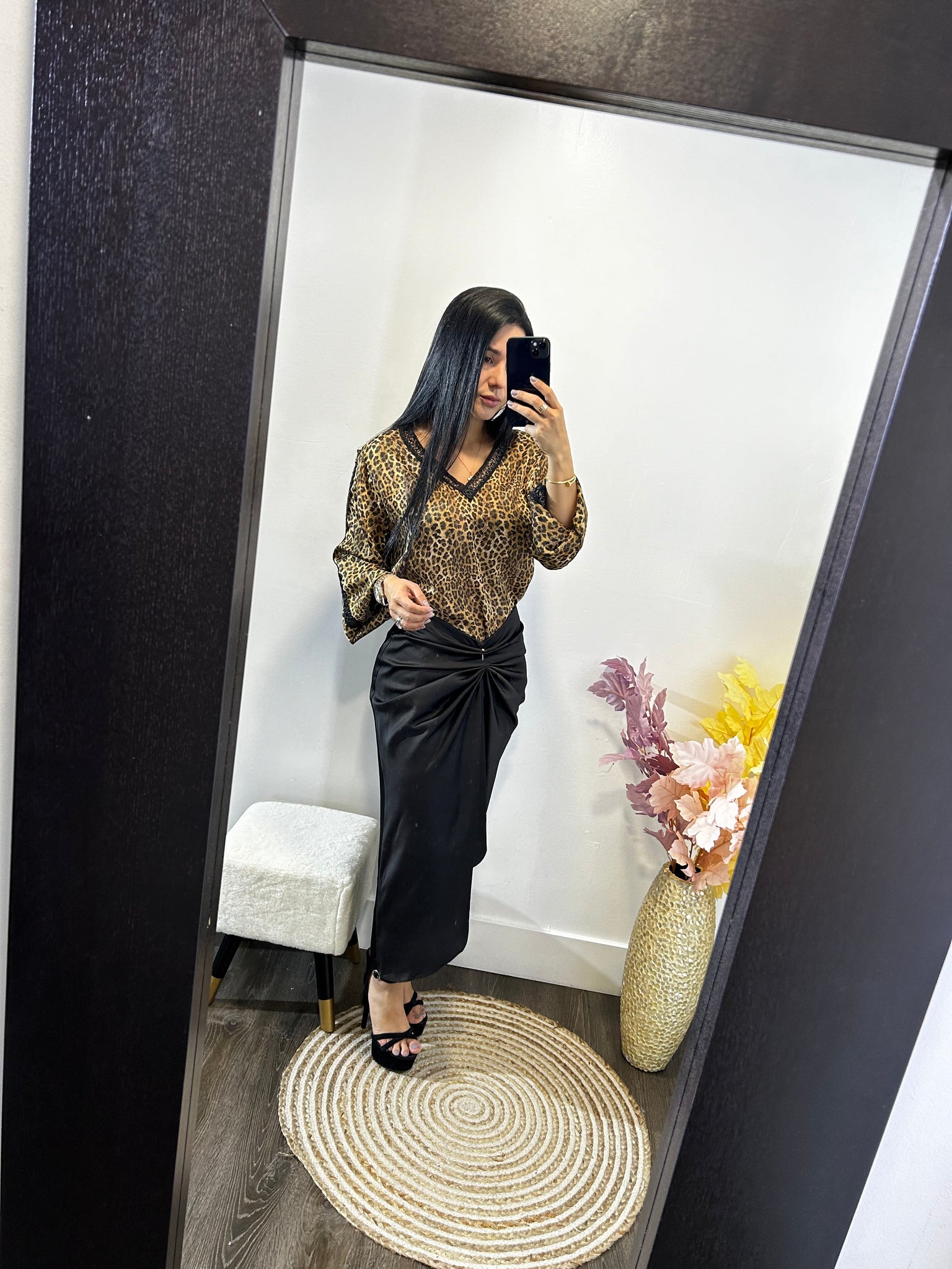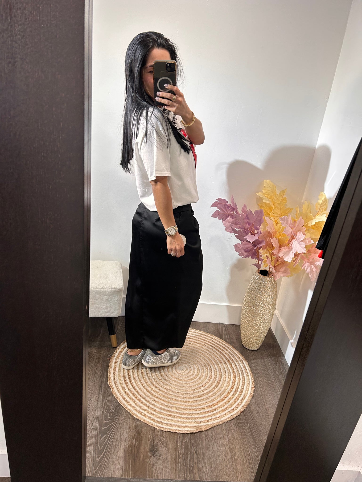 Falda satinada negra con aplique en la parte de adelante